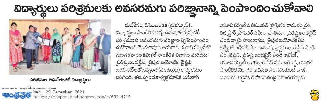 MOU between Anurag University and Prathista Industries on 22-12-2021