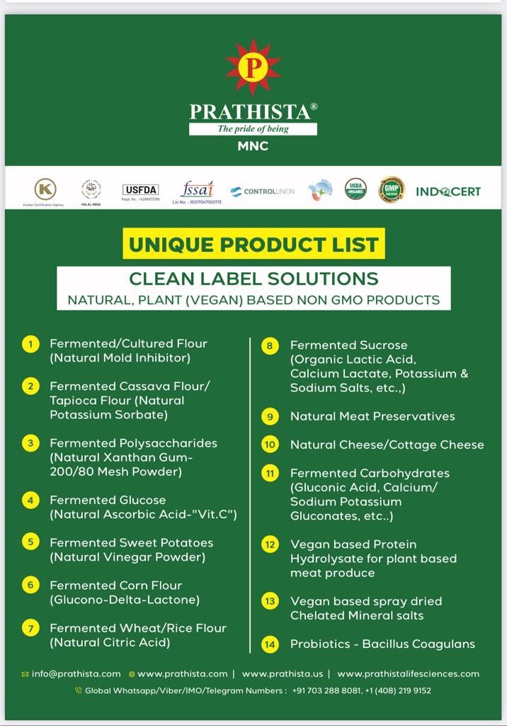 Prathista do have NPOP / NOP standard certifications also for more than 28 clean label & plant based food / feed / Pharma ingredient products